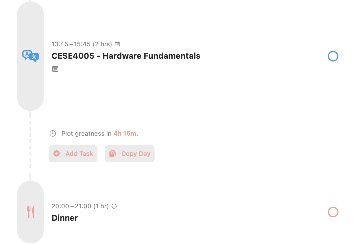 See the image above. It says I have 4h 15m of free time. But, for my daily productivity planning, I don’t want to plan anything past 17:30. So basically I have 2 hours left to plot greatness. It would be a better indicator for me if it just says 2 hours, so people should just be able to customise the end of day. Also could add a horizontal line at the end of day, so it’s clear I don’t want any productivity stuff after that. Ideally, before the horizontal line I would like “plot greatness” with 2 hours available and after the horizontal line I plan “for fun” for 2 hours. It can be such a combination.