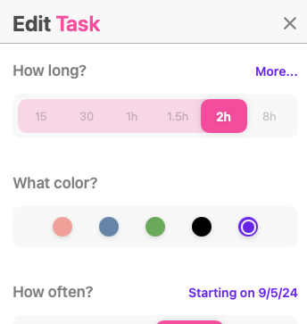 I’d love to be able to configure a repeating task’s end date. For example, I have a weekly meeting that starts the week of 9/5/24 but ends the week of 12/9/24; if y’all could add the option to designate an end date for a weekly task (vs. “repeat indefinitely”), that would be great :’)