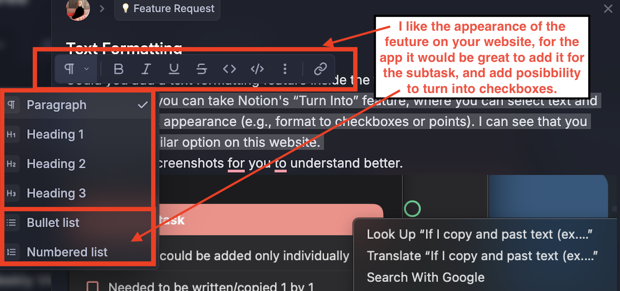 For reference, you can take Notion's “Turn Into” feature, where you can select text and then change its appearance (e.g., format to checkboxes or points). I can see that you also have a similar option on this website.